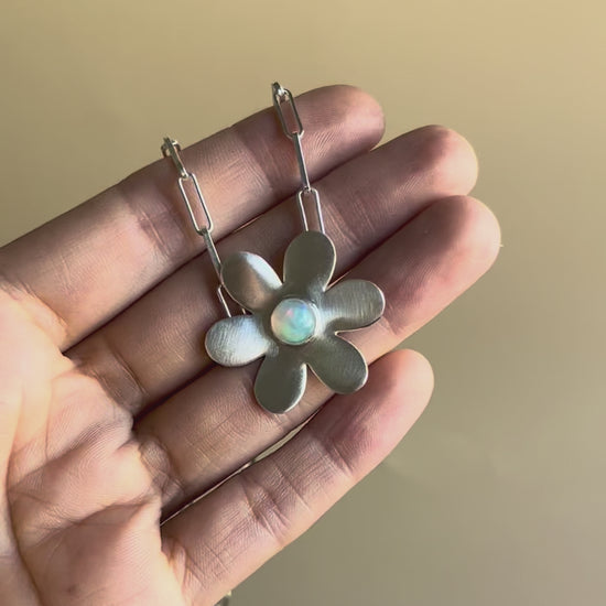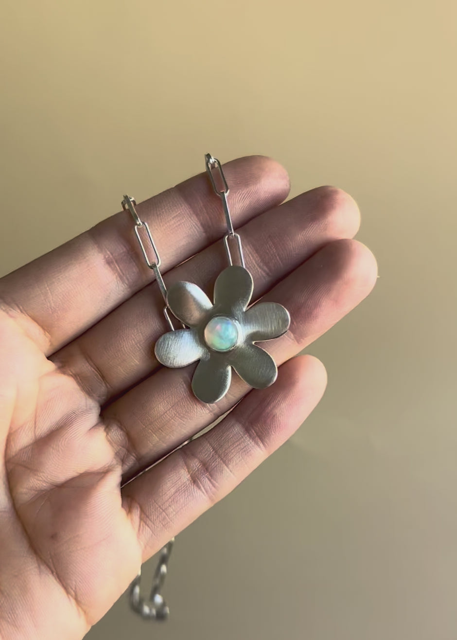 soft blooms & cosmic dreams. a sterling silver daisy cradling an opal. sunshine and stardust in one little pendant.